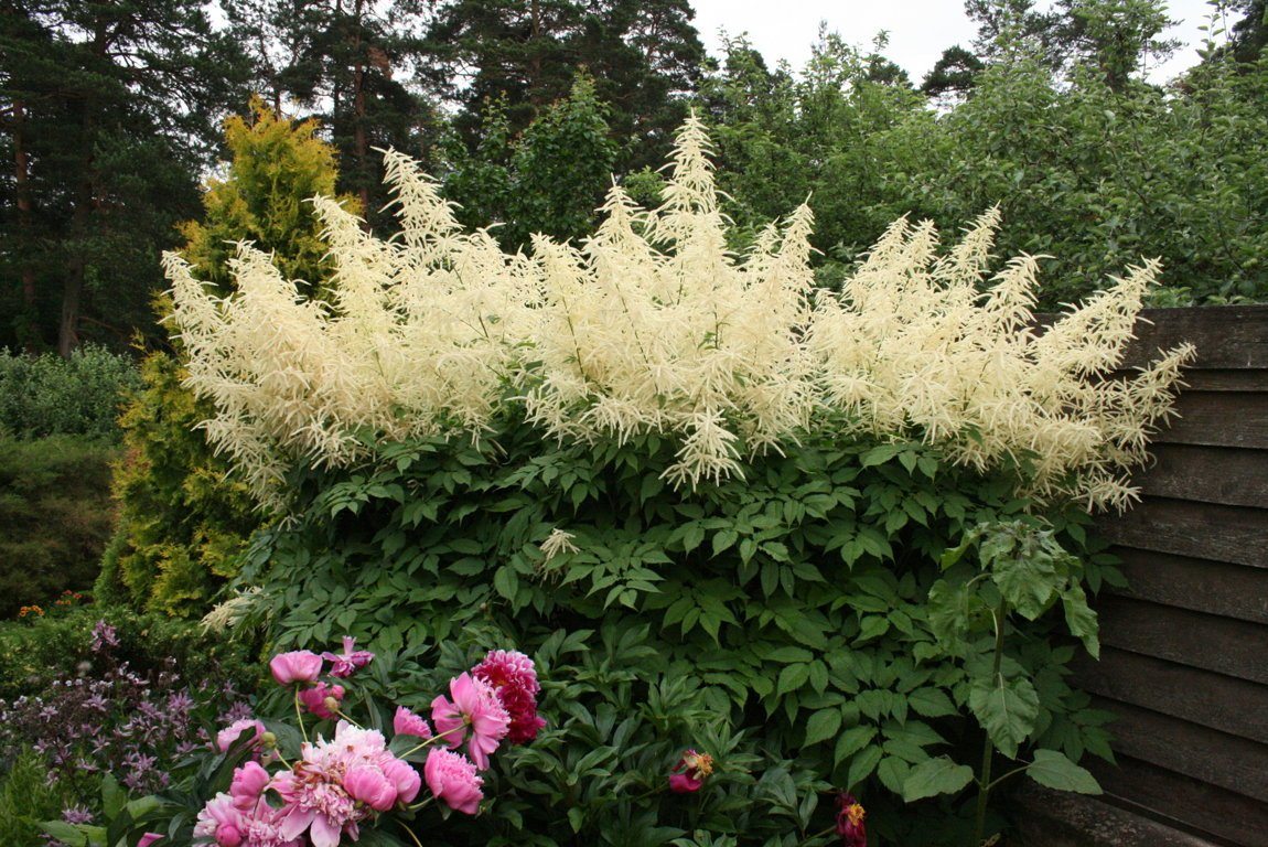 Астильба Арендса. В высоту не превышает 50-60 см, в июне распускается белыми, кремовыми и розовыми соцветиями. Отлично себя чувствует в тени и сырости.
